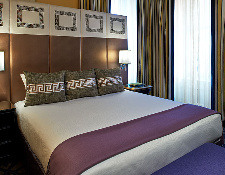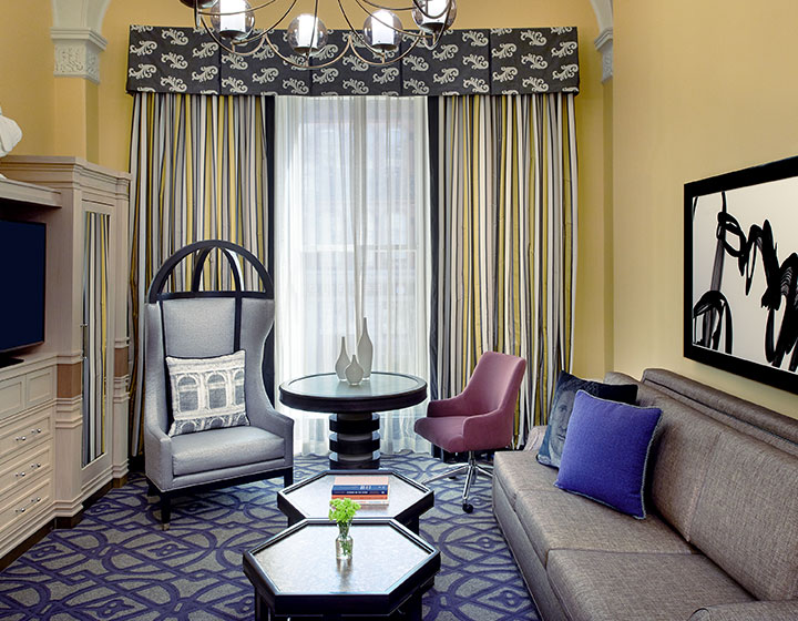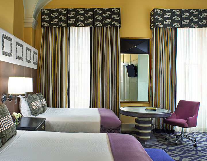 You'll know you're in the midst of greatness the second you enter our historic property and ogle the omnipresent lion heads, soaring ceilings, grand marble staircases, and our bold, playful style. Our rooms and suites (184 total) boast a welcoming vibe that merges refined with contemporary. Find dazzling geometric shapes, furnishings detailed with warm-toned oaks, and regal hues like plum, champagne, and royal blue that energize every layout of room we have on offer.