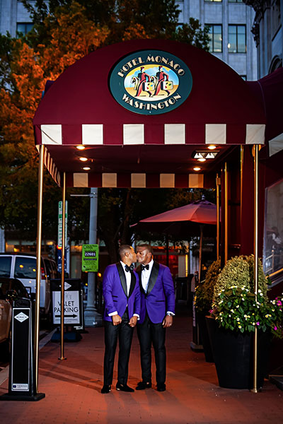 Darius, a speech pathologist, and Phillip, a government affairs manager, knew they wanted to get married in Washington. “DC is the center of our life,” says Darius. Kimpton Hotel Monaco DC charmed the couple with its gorgeous interior design — and with the “warm and confident demeanor” of the hotel’s event director, Buddee.